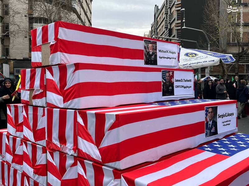 كما تم أيضا عرض نعوش رمزية لكبار القادة الأمريكيين على هامش مسيرات ذكرى انتصار الثورة الاسلامية في رسالة دلالية واضحة هذا سيكون مصيركم في حال فكرتم بالاعتداء على إيران.