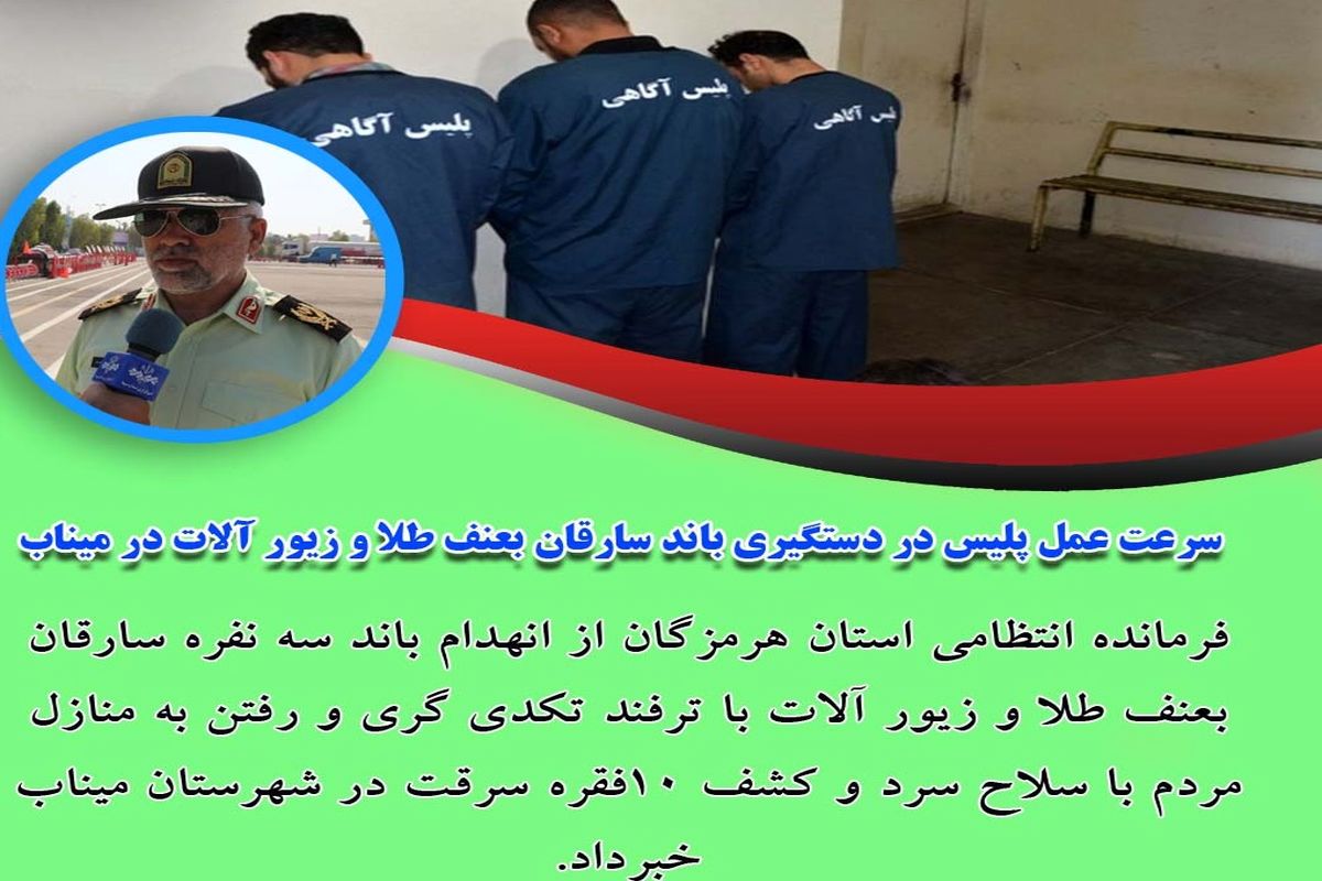 فرمانده انتظامی هرمزگان از انهدام باند سه نفره سارقان بعنف طلا و زیور آلات با ترفند تکدی گری و رفتن به منازل مردم با سلاح سرد، با کشف 10فقره سرقت در شهرستان میناب خبرداد.