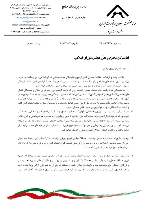 رئیس هیات مدیره خانه صنعت، معدن و تجارت ایران در ادامه نامه خود خطاب به نمایندگان در مجلس شورای اسلامی آورده است: به عنوان تشکل فراگیر اقتصادی بخش خصوصی، خود را به جز فعالان اقتصادی این بخش، وامدار و مدیون هیچ فرد، سازمان، دولت و جریان سیاسی، اقتصادی ندانسته و منافع ملی را بر هر چیز دیگری ارجح میدانیم. بر همین مبنا چنانچه تغییر هر وزیری را در هر زمان به صالح کشور بدانیم، بیپرده و به صراحت از نمایندگان مجلس شورای اسلامی استمداد یاری خواهیم خواست.