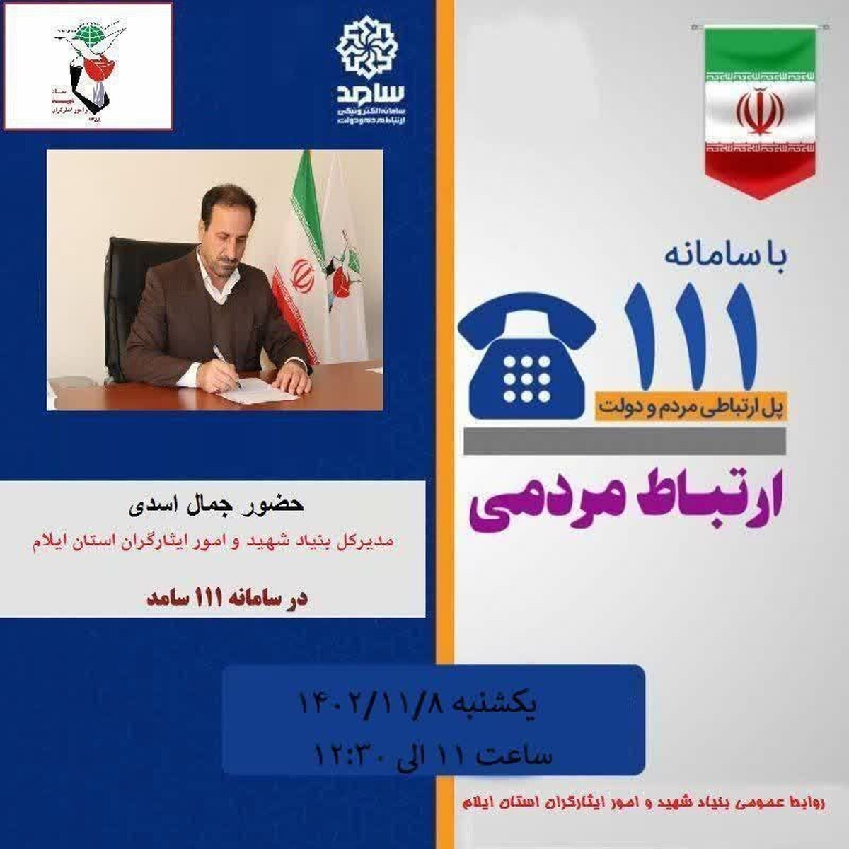 به گزارش خبرگزاری برنا ازایلام ، جمال اسدی مدیرکل بنیاد شهید و امور ایثارگران در سامانه ارتباط دولت با مردم(سامد) استانداری در خصوص پاسخگویی به مطالبات و درخواست های مردمی، خانواده شهدا،ایثارگران وجانبازان در راستای اجرای نظام نامه مدیریت ارتباطات مردمی در بستر سامد و تبیین اهداف دولت مردمی و تحقق مصادیق حقوق شهروندی روز یکشنبه ۸ بهمن ماه در محل سامانه سامد حضور خواهد یافت و پاسخگوی سوالات مردمی و مطالبات جامعه هدف و مردم می باشد