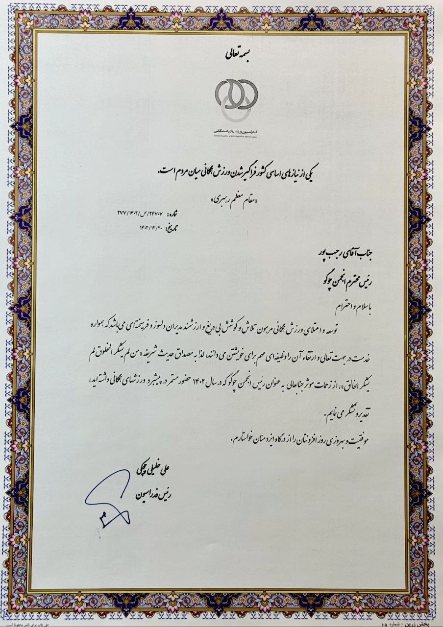 طالب رجب پور رییس ورزش چوگوی ایران در آئین تجلیل از برنامههای چوگو گفت: انجمن ورزشی چوگو در سال ۱۴۰۲ برنامههای متنوع و مؤثری داشته وتقریبا مطالبات فدراسیون را محقق کرده است .