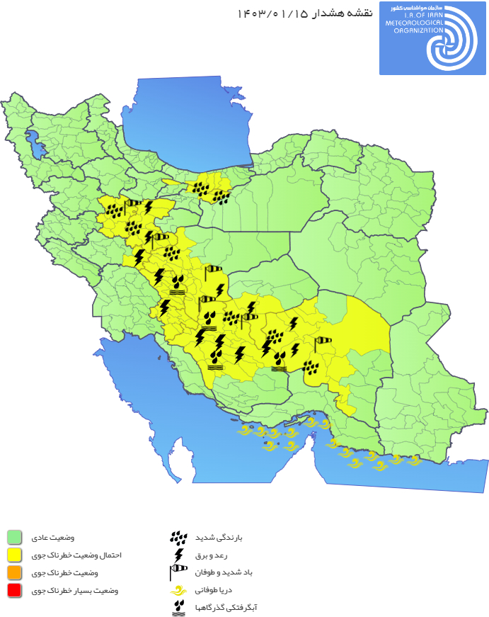 بر اساس این گزارش امروز در نیمه غربی کرمان، نیمه شمالی فارس، چهارمحال و بختیاری، کهگیلویه و بویراحمد، جنوب و غرب اصفهان، جنوب شرق لرستان، جنوب یزد و فردا (پنجشنبه ۱۶ فروردین) در نیمه شمالی استانهای کرمان و سیستان و بلوچستان شاهد فعالیت این سامان بارشی خواهیم بود.