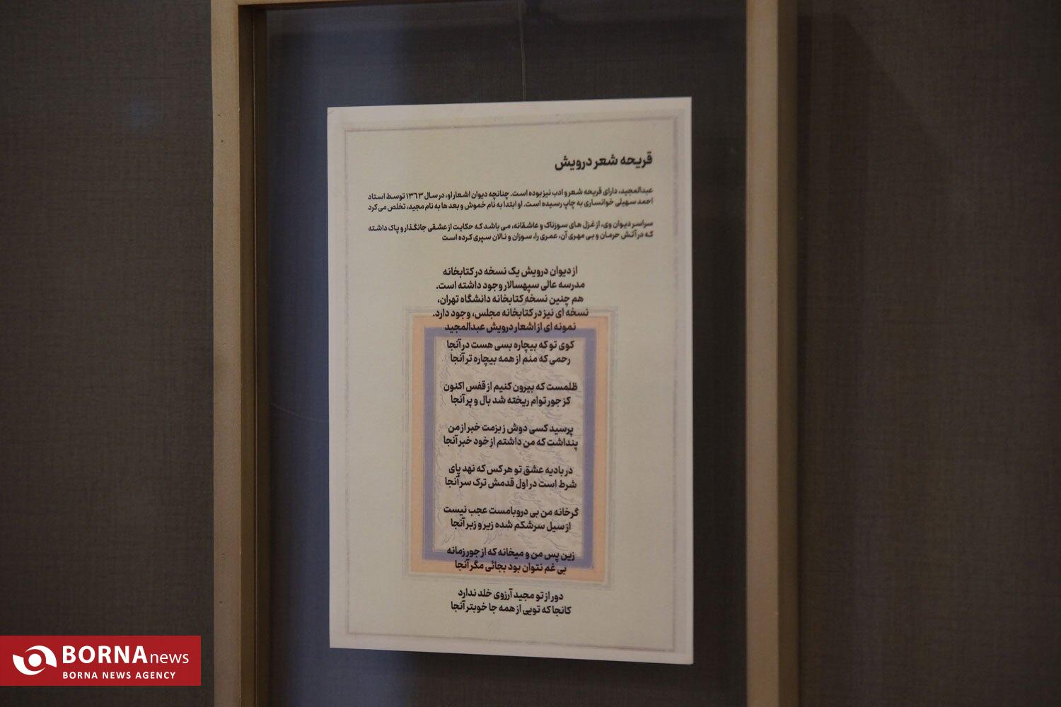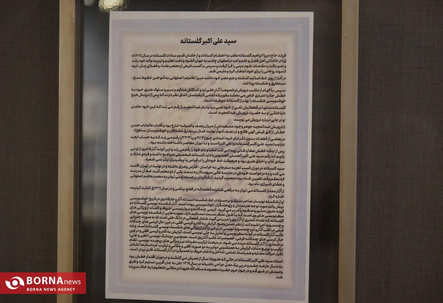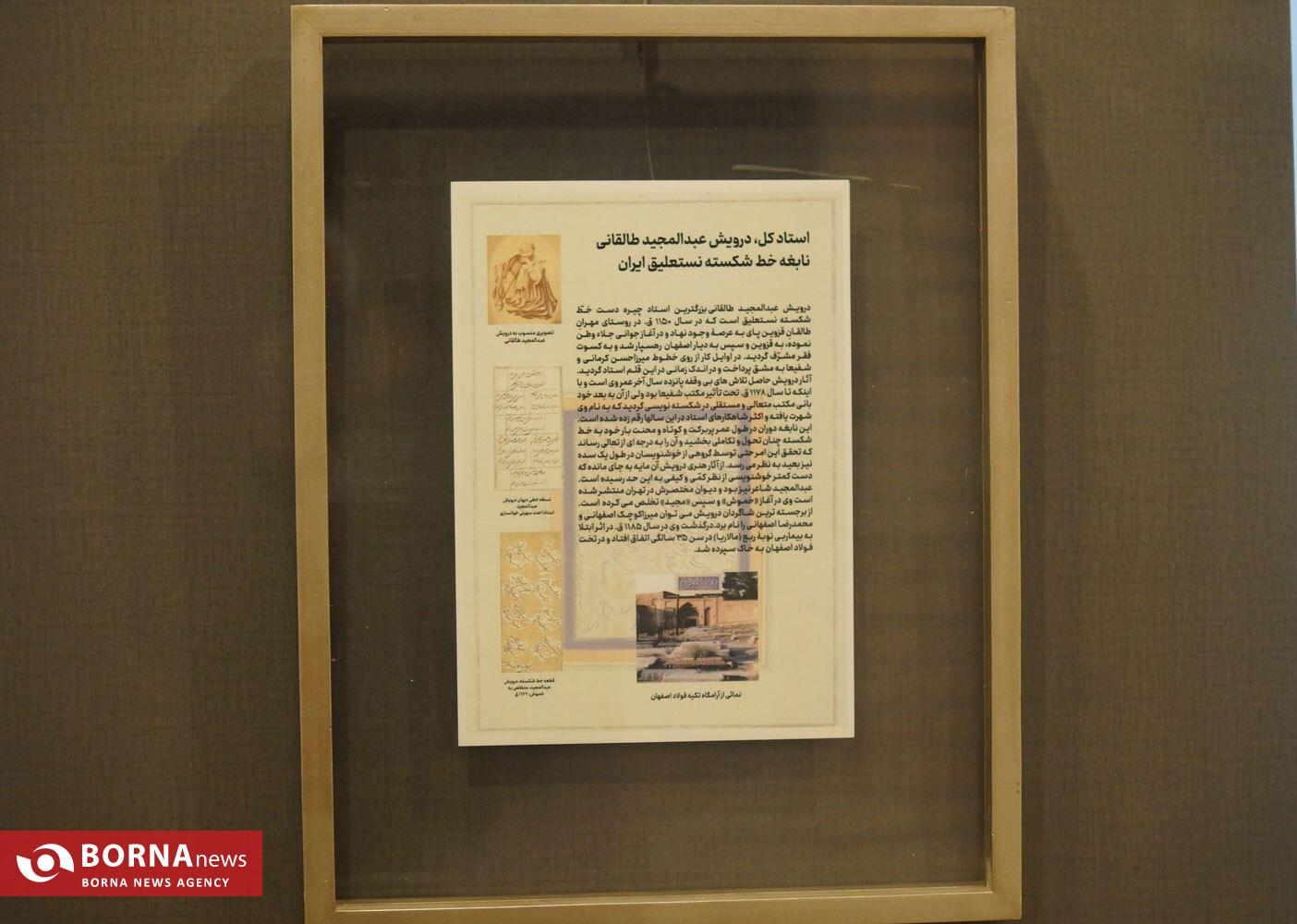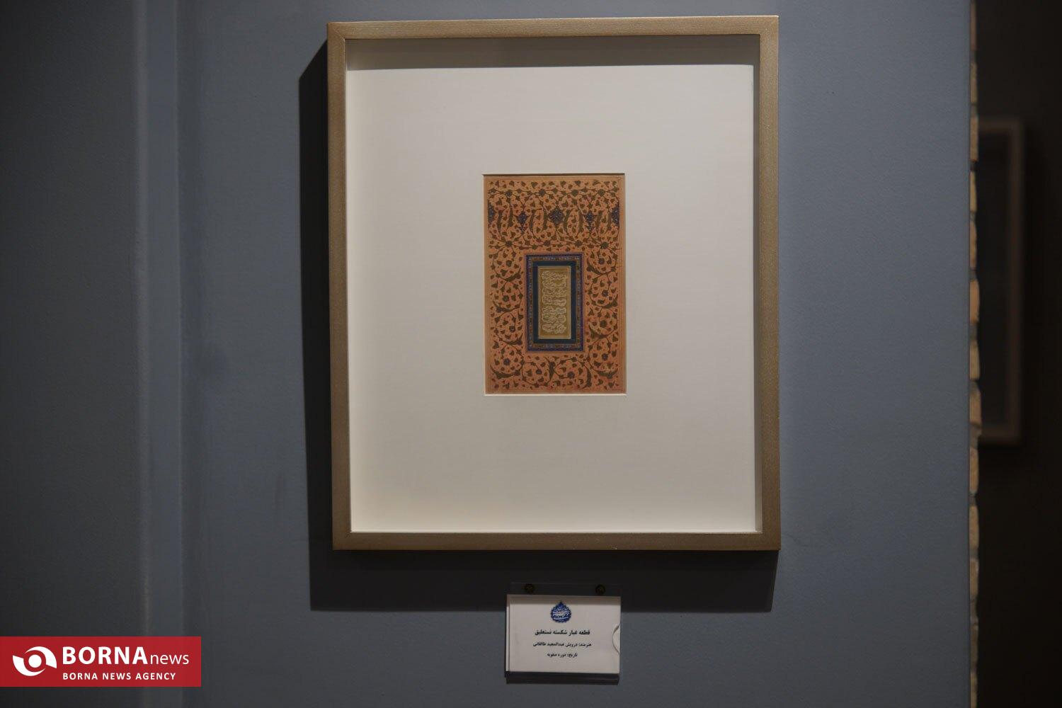 آثار خوشنویسی درویش عبدالمجید مهرانی طالقانی خوشنویس، شاعر و عارف قرن دوازده ایران در قالب شکسته نستعلیق و «علیاکبر گلستانه» در بخش گنجینهها از روز ۲۴ بهمن تا ۸ اسفند و از ساعت ۱۶ در موزه خوشنویسی برپا خواهد بود.