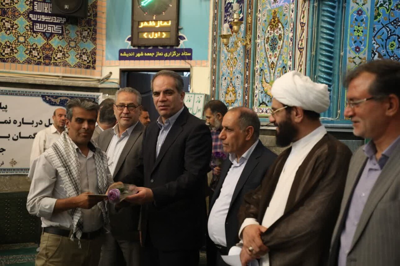 به گزارش خبرگزاری برنا از تهران ؛ در مراسم عبادی ـ سیاسی نماز جمعه این هفته شهر اندیشه با حضور نمازگزاران، حجتالاسلام والمسلمین باباییان امام جمعه شهراندیشه، دکتر حقوردی نماینده مردم در مجلس شورای اسلامی، رحیمی معاون سیاسی فرمانداری ویژه شهرستان شهریار، تاجیک فرماندهی ناحیه مقاومت بسیج شهر اندیشه، مهندس بهروز کاویانی شهردار اندیشه، بهرامی رئیس شورای اسلامی شهر اندیشه و کردی رئیس بنیاد شهید و امور ایثارگران شهرستان شهریار از جمعی از ازادگان سرافراز شهر اندیشه تقدیر و تجلیل به عمل آمد.