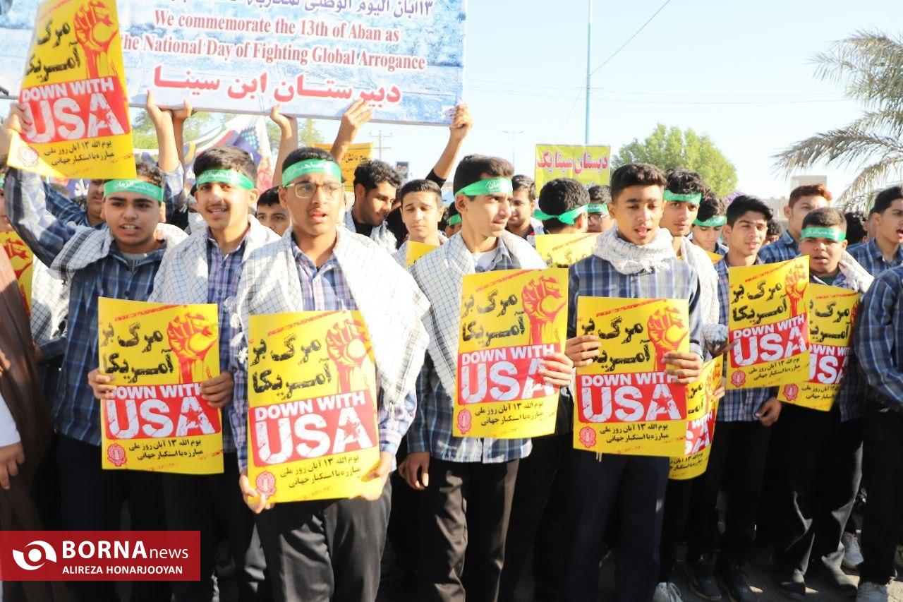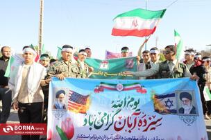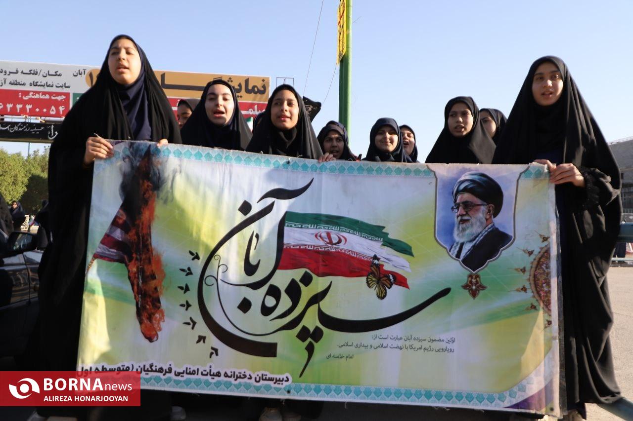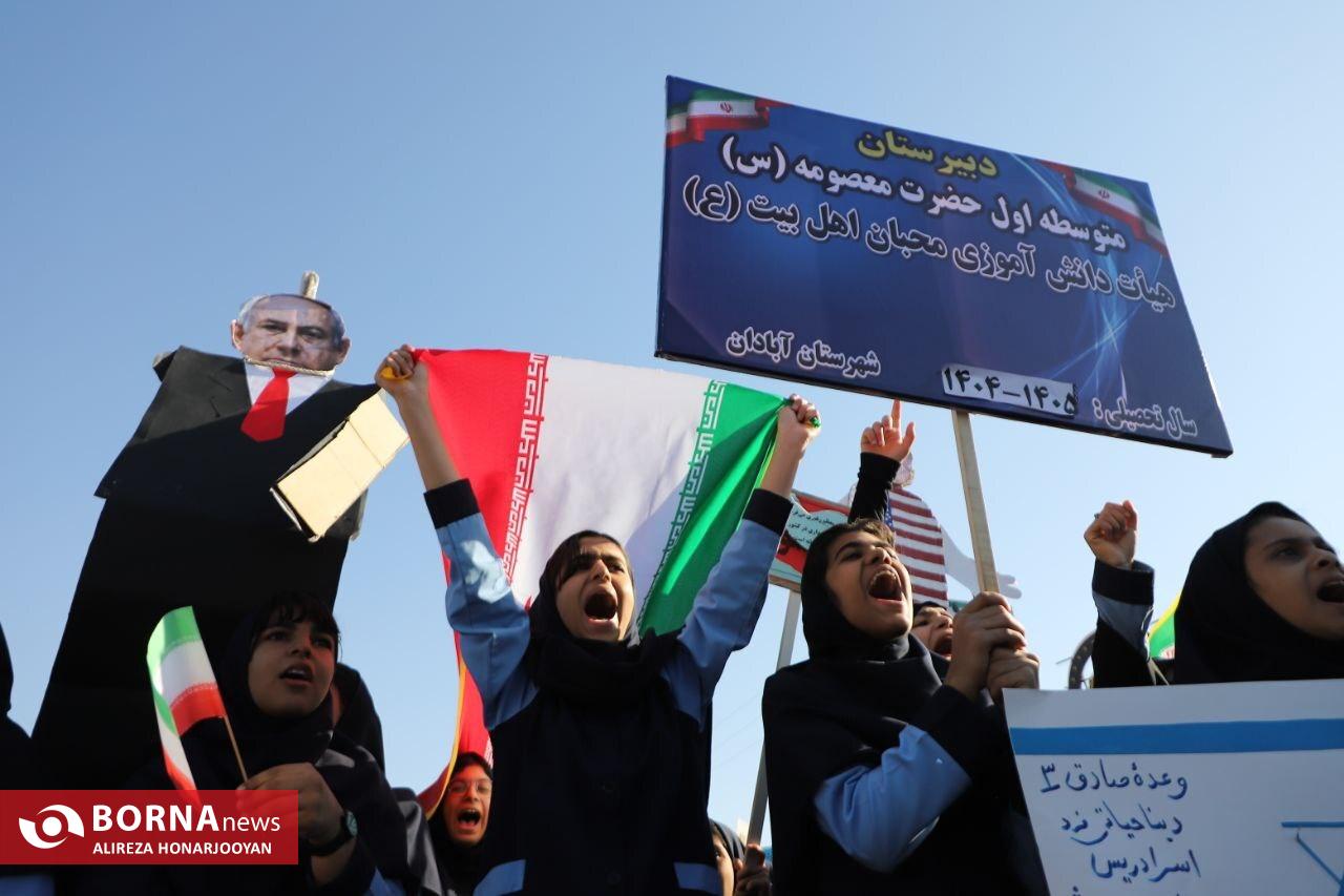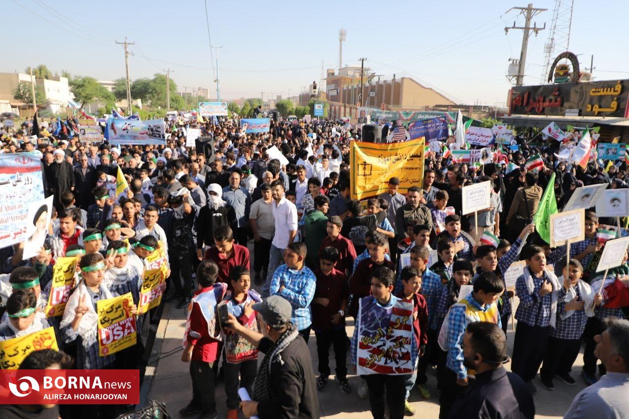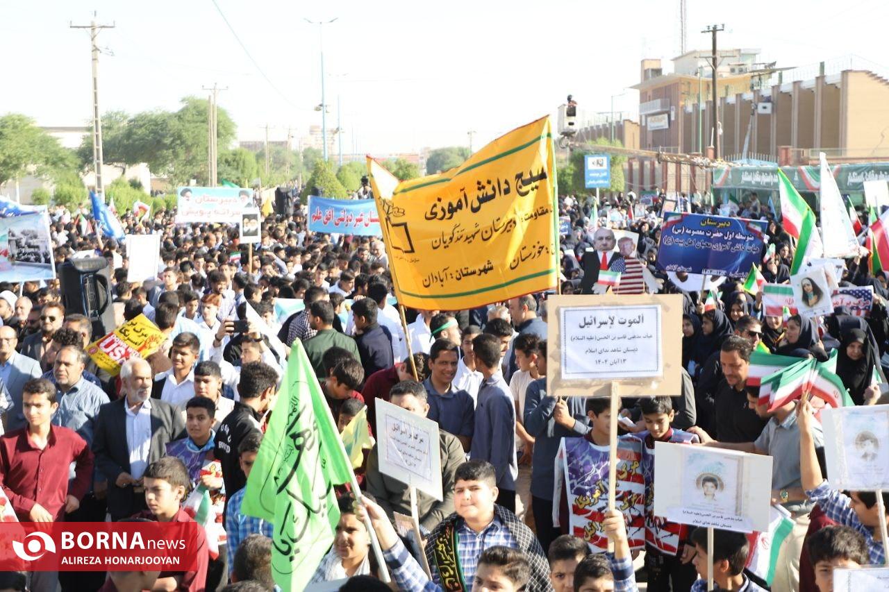 همزمان با سراسر کشور، اقشار مختلف مردم آبادان بهویژه دانشآموزان و فرهنگیان با حضور گسترده در راهپیمایی یومالله ۱۳ آبان، انزجار خود را از سیاستهای استکبار جهانی اعلام و بار دیگر بر پایبندی به آرمانهای انقلاب اسلامی تاکید کردند. عشایر اروند در این راهپیمایی فریاد زدند: "ما تا پیروزی ایستادهایم".