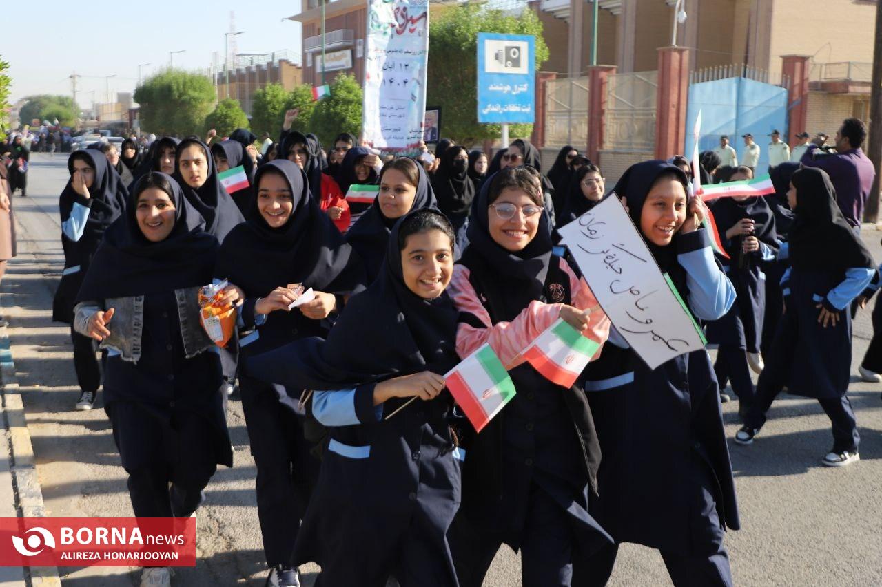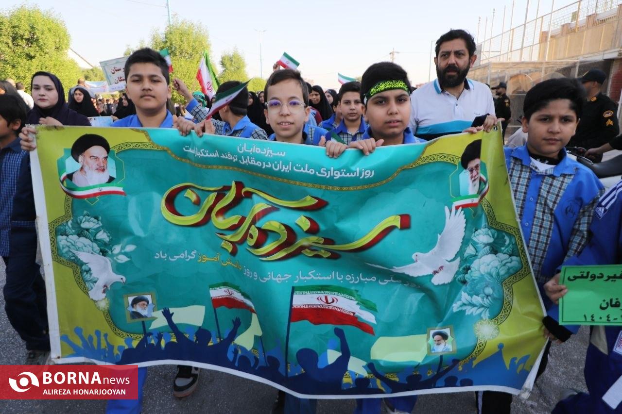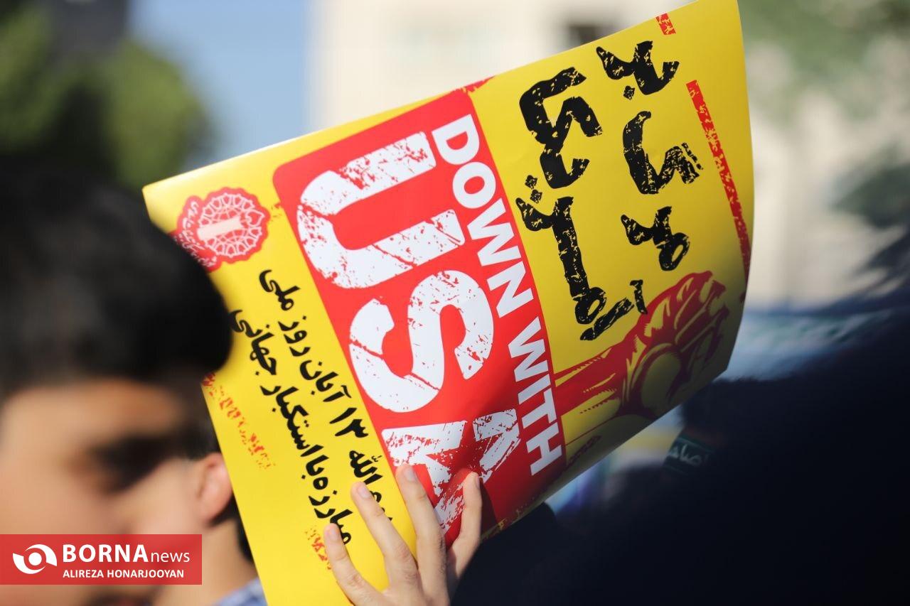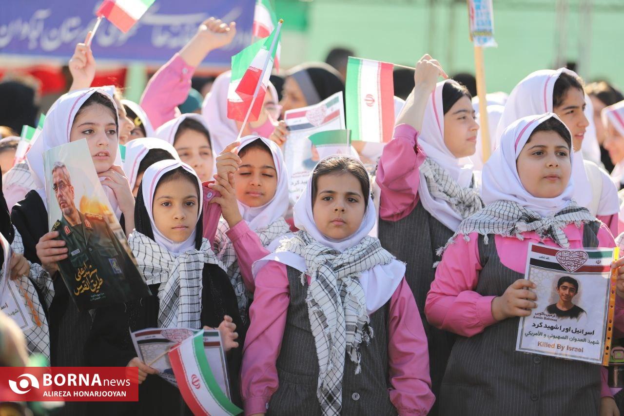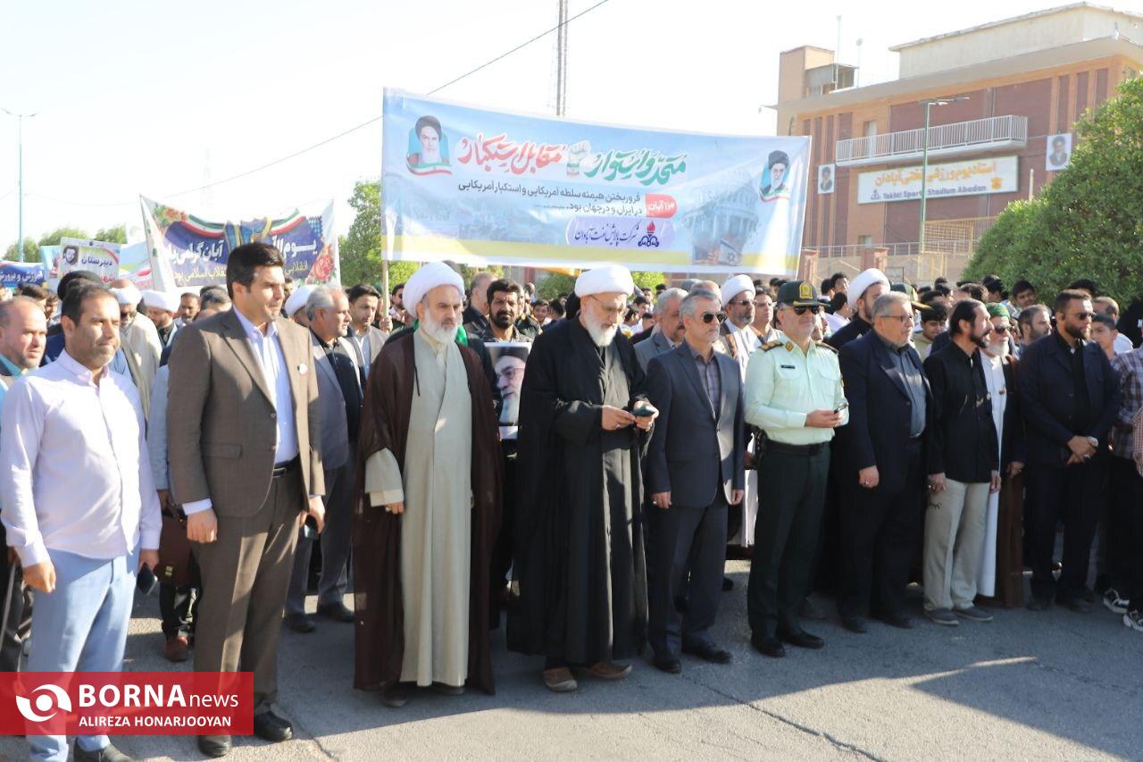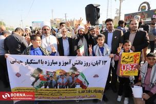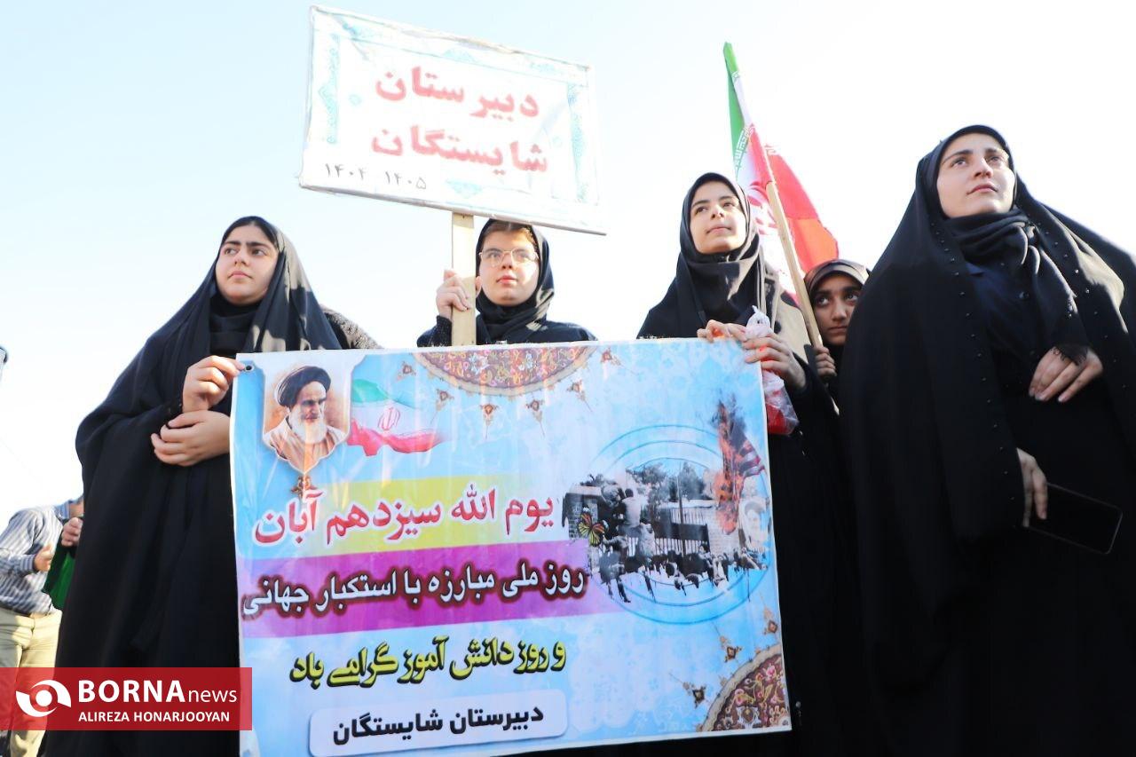 همزمان با سراسر کشور، اقشار مختلف مردم آبادان بهویژه دانشآموزان و فرهنگیان با حضور گسترده در راهپیمایی یومالله ۱۳ آبان، انزجار خود را از سیاستهای استکبار جهانی اعلام و بار دیگر بر پایبندی به آرمانهای انقلاب اسلامی تاکید کردند. عشایر اروند در این راهپیمایی فریاد زدند: "ما تا پیروزی ایستادهایم".