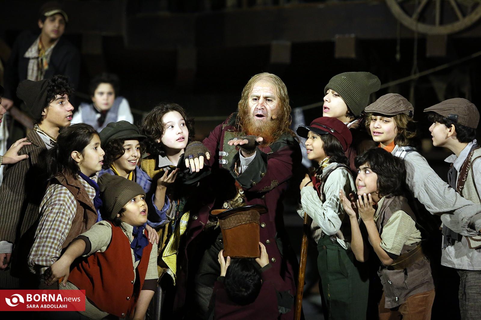 هوتن شکیبا، بهنوش طباطبایی، بانیپال شومون، امیرکاوه آهنینجان، سیامک انصاری و کاظم سیاحی ایفاگر نقشهای اصلی این نمایش هستند و بازیگران نوجوان رایان سرلک نقش داجر ناقلا را ایفا میکند و پرهام غلاملو و آرشام جهانپناه، در شبهای مختلف نقش الیور توئیست را بازی میکنند. همچنین مونا صوفی، سارا پارسایی، سردار سرمست، محمدامین پازکی، مارال قادری، سایه پارسایی، پرهام موحدی و ساره حمزه دیگر بازیگران این اثر هستند.