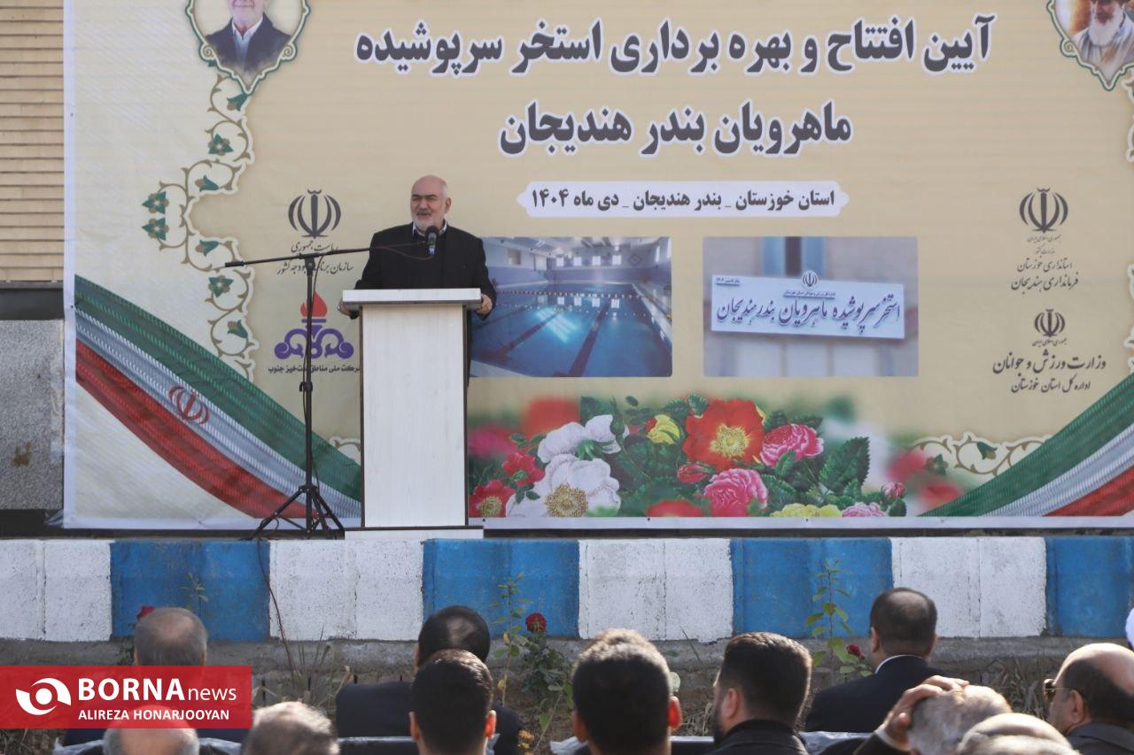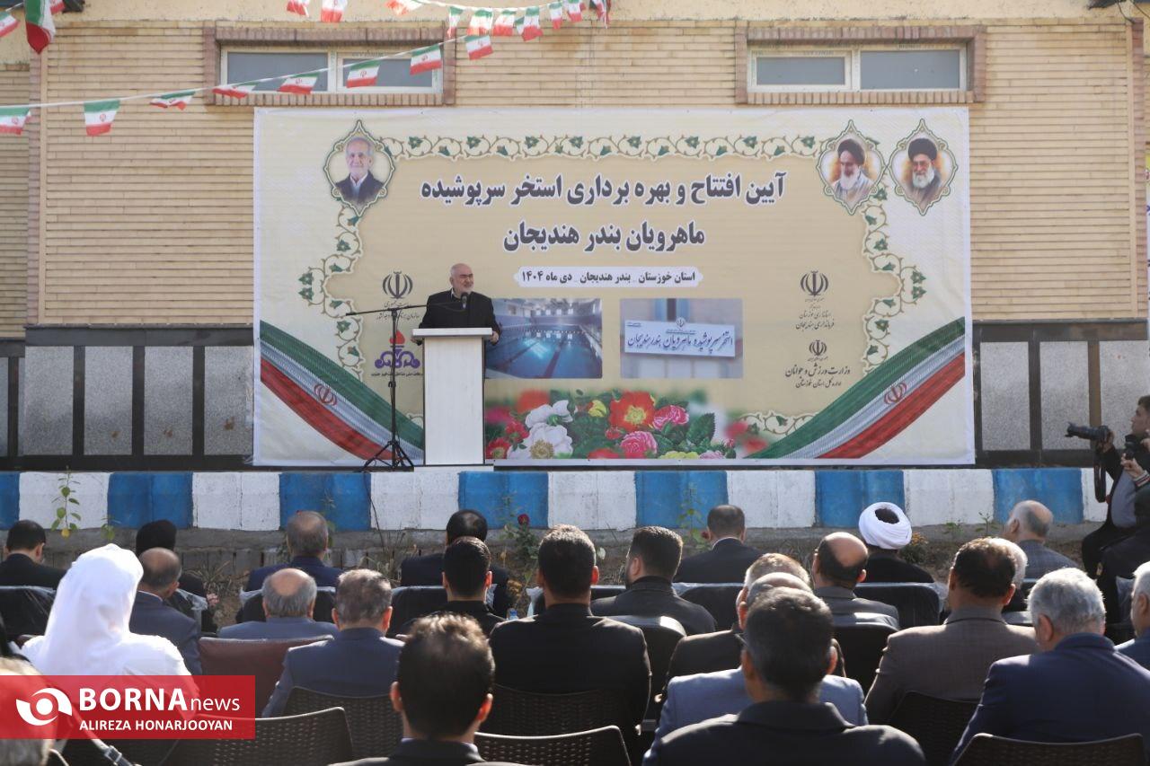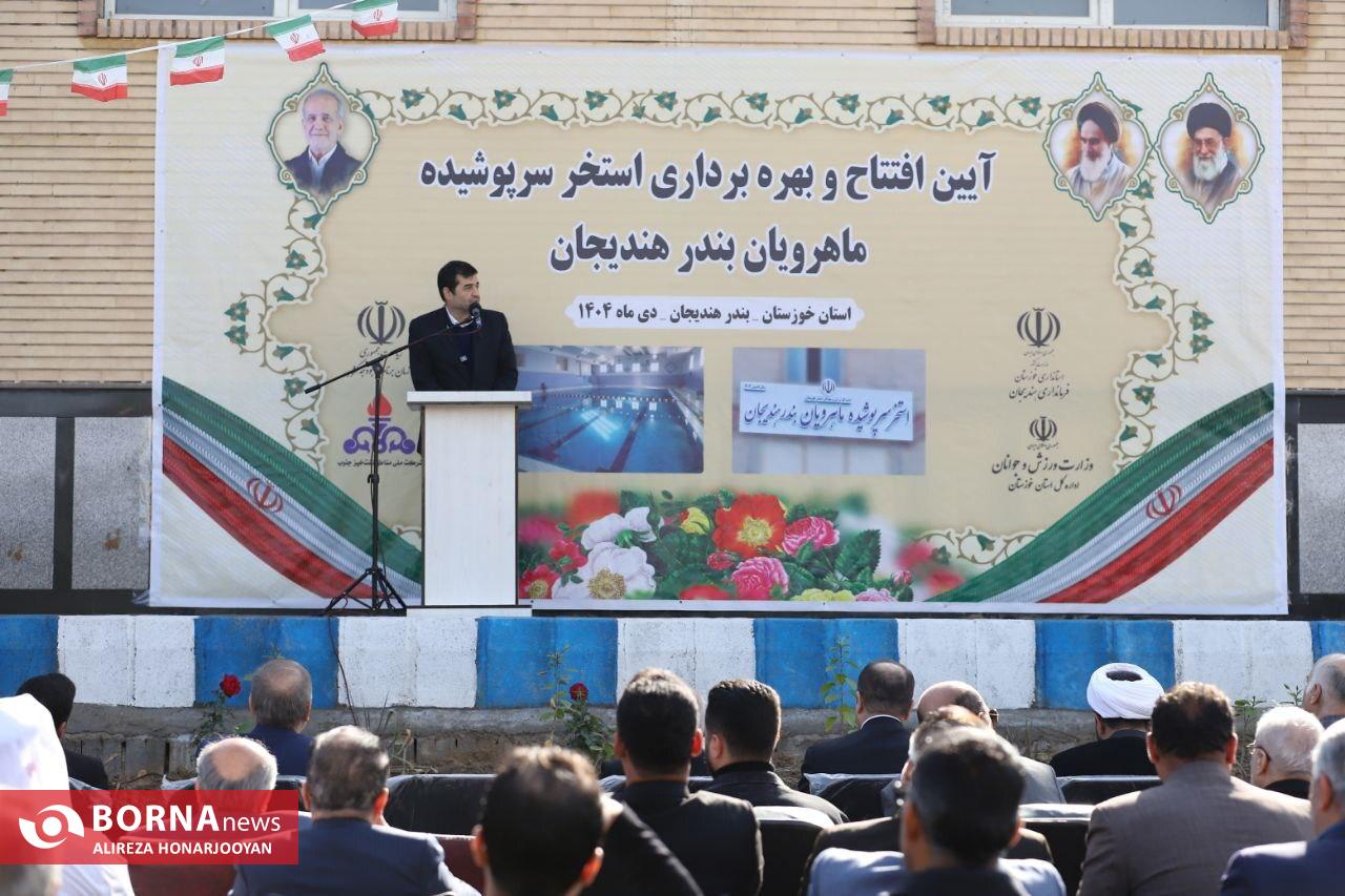 وزیر ورزش و جوانان در آغاز سفر یک روزه خود به استان خوزستان وارد هندیجان شد و استخر ماهرویان این شهرستان را که عملیات اجرایی آن از سال ۱۳۸۹ آغاز شده بود(پس از ۱۵ سال) افتتاح کرد. این مجموعه ورزشی در زمینی با زیربنای دو هزار و ۵۰۰ مترمربع احداث شده و شامل استخر اصلی، استخر ویژه کودکان، سونا و جکوزی است که با هدف توسعه زیرساختهای ورزشی و ارتقای سلامت عمومی شهروندان به بهرهبرداری رسیده است. برای اجرای این پروژه، اعتباری بالغ بر ۷۰ میلیارد تومان هزینه شده که از محل اعتبارهای استانی و مسوولیتهای اجتماعی وزارت نفت تامین شده است.بهرهبرداری از استخر سرپوشیده هندیجان گامی مهم در راستای توسعه فضاهای ورزشی و پاسخ به مطالبه های دیرینه مردم این شهرستان به شمار میرود. لازم به توضیح است که این مراسم با حضور سید محمدرضا موالی زاده استاندار خوزستان، سیدغنی نظری معاون مجلس، حقوقی و امور استانها، امیر حیات مقدم نماینده مردم ماهشهر و هندیجان در مجلس شورای اسلامی و حمید بنی تمیم مدیر کل ورزش و جوانان استان خوزستان برگزار شد.