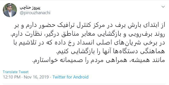 به گزارش گروه اجتماعی خبرگزاری برنا؛ پیروز حناچی، شهردار تهران، در توییتر خود درباره وضعیت تهران بعد از بارش برف گفت: از ابتدای بارش برف در مرکز کنترل ترافیک حضور دارم و بر روند برفروبی و بازگشایی معابر مناطق درگیر، نظارت دارم. در برخی شریانهای اصلی انسداد رخ داده که در تلاشیم با هماهنگی دستگاهها آنها را بازگشایی کنیم. مانند همیشه، همراهی مردم را صمیمانه خواستارم.